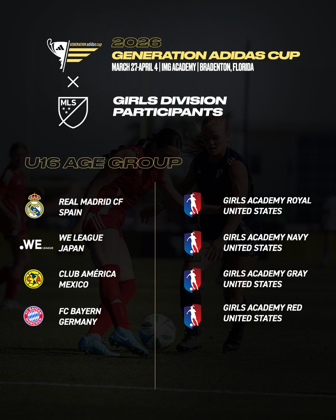 At the 2026 Generation Adidas Cup, four international clubs have been announced as part of the 8-team U16 Girls Division: Real Madrid (Spain), We League (Japan), Club America (Mexico) and FC Bayern Munich (Germany).