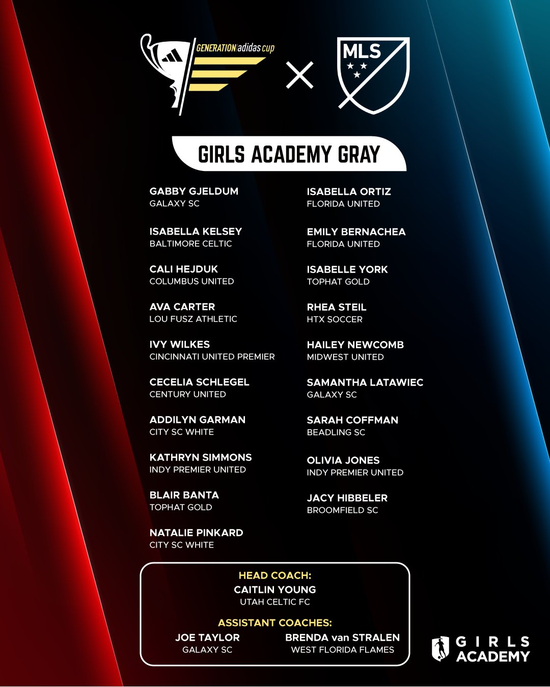 Four All-Star Teams composed of top players from across the Girls Academy will take part in the tournament, as they will be the second group of girls’ teams to compete in the historically boys-only event. The 2025 Generation Adidas Cup marked the debut of the girls’ divisions, and the GA All-Star teams earned 1st place and 2nd place, beating out European clubs Manchester City and FC Bayern Munich.